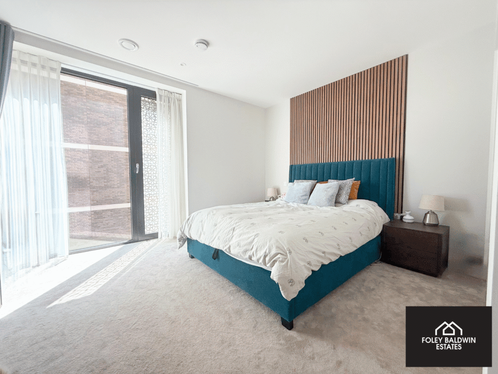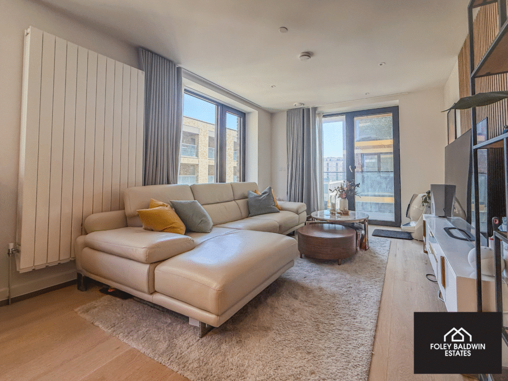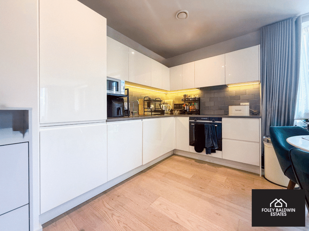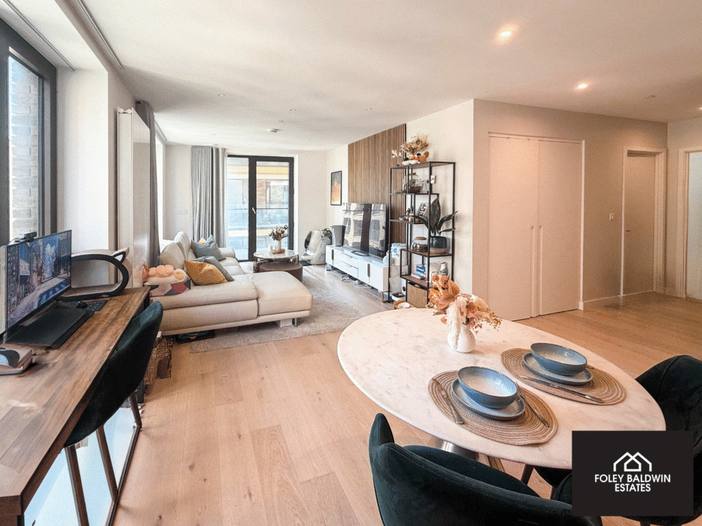 The apartment comprises two well-proportioned bedrooms, including a principal bedroom with a sleek en-suite, as well as a separate modern family bathroom. High-quality finishes run throughout, with engineered oak flooring, and contemporary monochrome bathrooms providing a stylish, clean aesthetic.