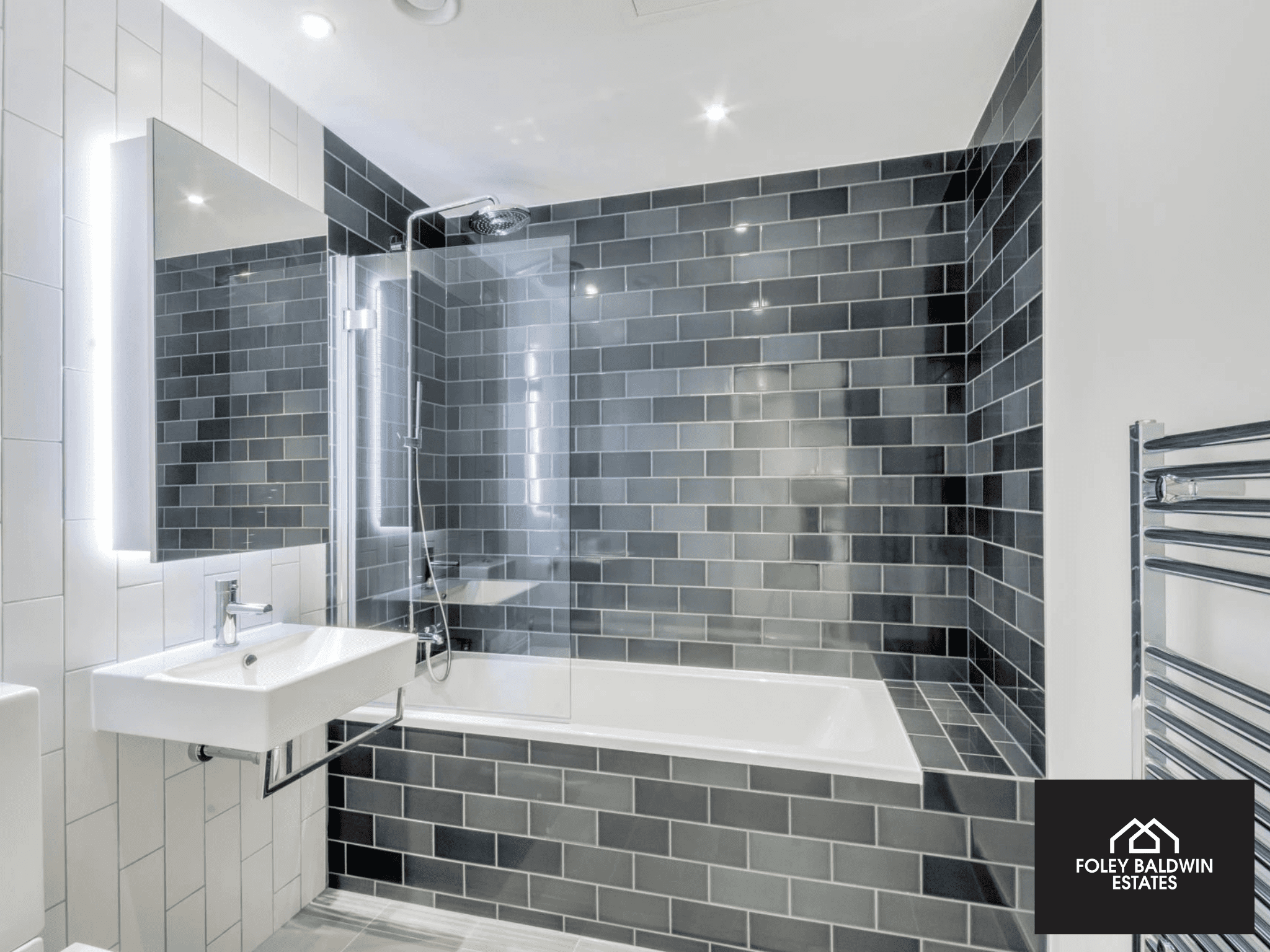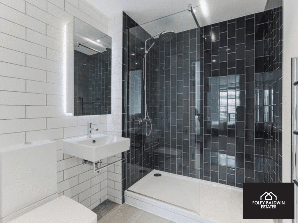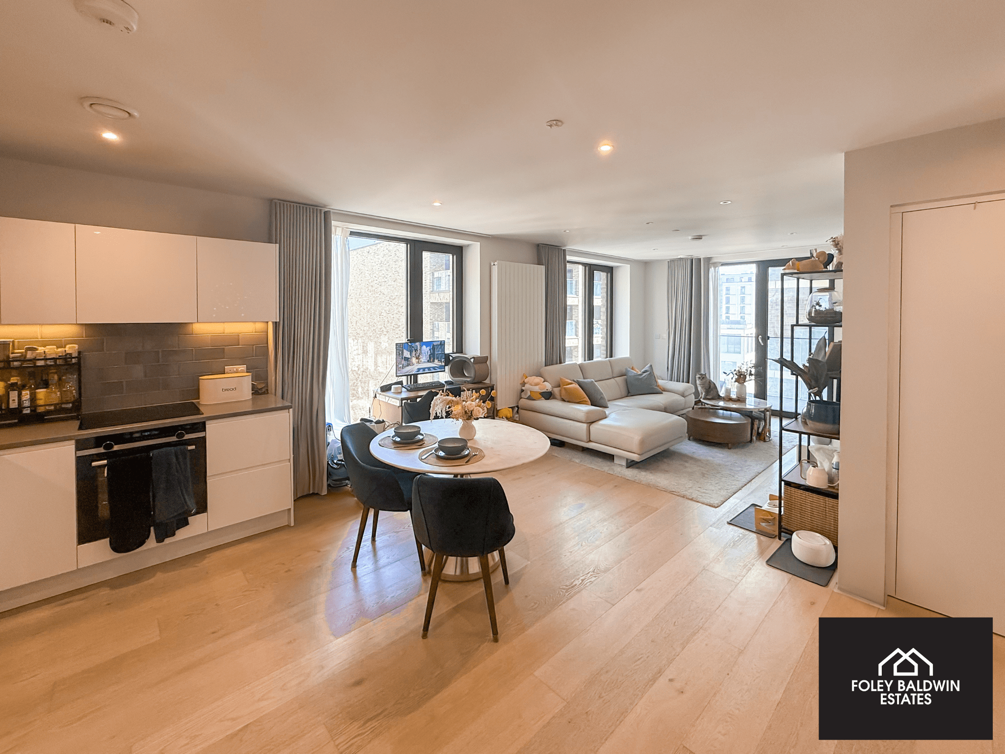 The apartment comprises two well-proportioned bedrooms, including a principal bedroom with a sleek en-suite, as well as a separate modern family bathroom. High-quality finishes run throughout, with engineered oak flooring, and contemporary monochrome bathrooms providing a stylish, clean aesthetic.